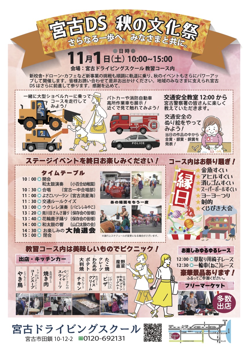 11月1日(土)10:00〜15:00、宮古ドライビングスクールの教習コース内で楽しいイベント盛りだくさんで開催します!