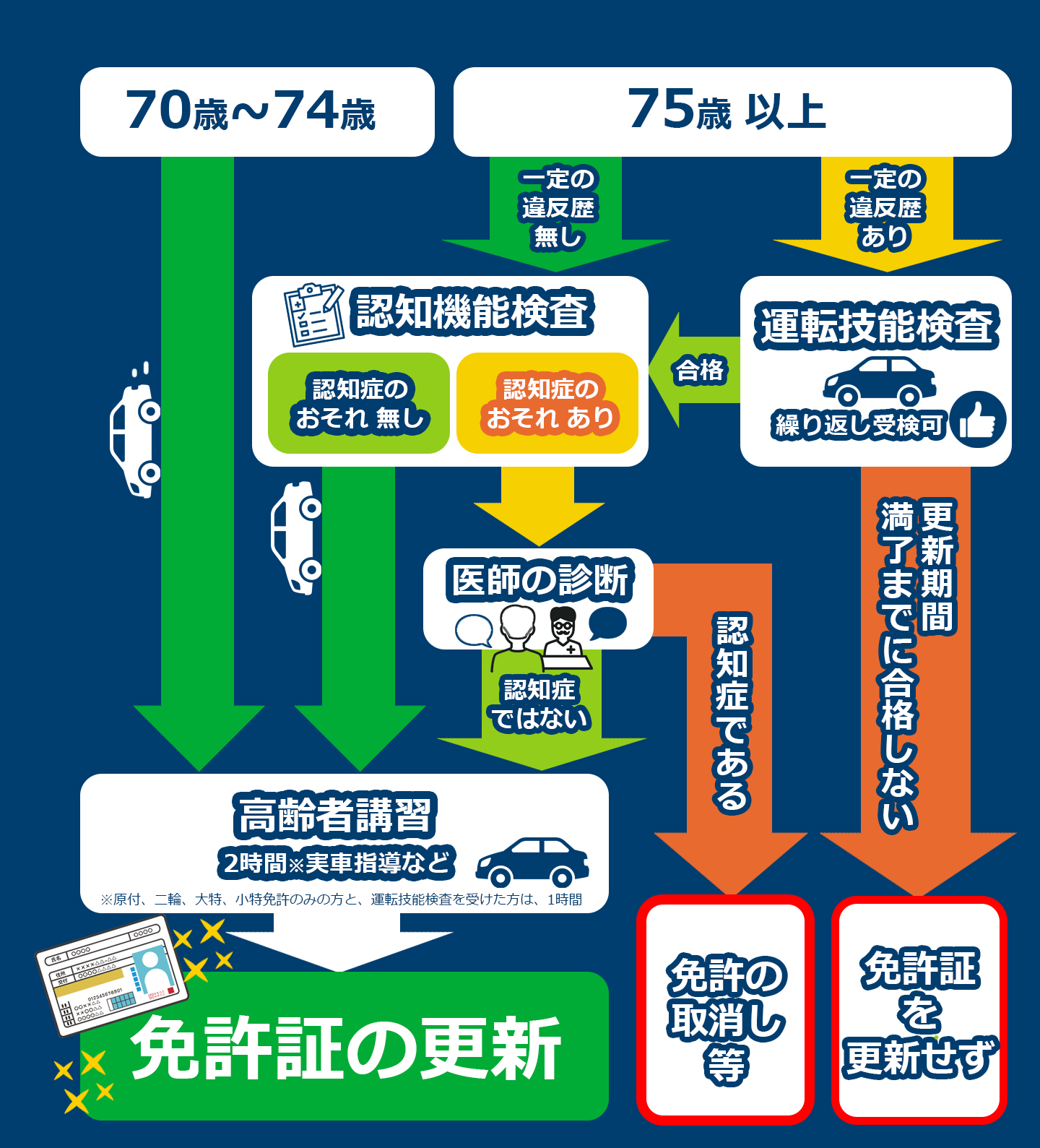 さらに、75歳以上 の方が免許更新を希望される場合は、「認知機能検査」の対象となります。この講習および検査は、誕生日の5か月前から免許証の有効期限までの間に受講可能です。